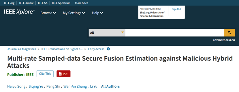 近日,金年会2021级人工智能3班本科生叶思卿同学在宋海裕教授的指导下,在IEEE Transactions汇刊《IEEE Transactions on Signal and Information Processing over Networks》上发表了题为“Multi-rate Sampled-data Secure Fusion Estimation against Malicious Hybrid Attacks”的研究论文(导师一作、学生二作)。
