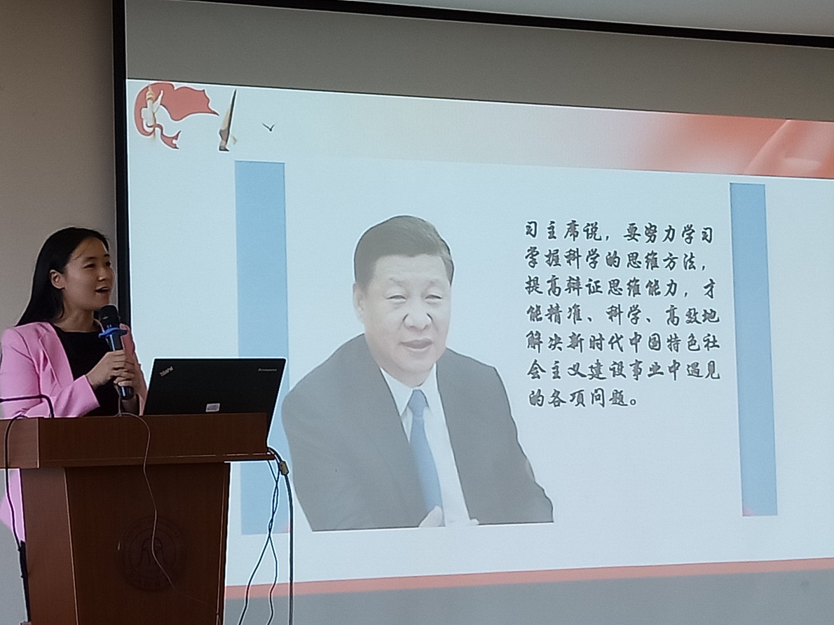 会上,朱凌老师围绕“四个讲清”给支部全体党员上了一堂主题鲜明、内涵深刻的党课。朱凌老师指出守初心,就是要牢记全心全意为人民服务的根本宗旨;担使命,就是要牢记我们党肩负的实现中华民族伟大复兴的历史使命;同时,朱凌老师引用了习主席所说的话“要努力学习掌握科学的思维方法,提高辩证思维能力,才能精准、科学、高效地解决新时代中国特色社会主义建设事业中遇见的各项问题。”