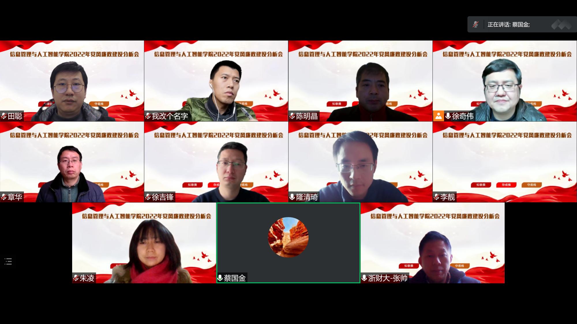 1月10日下午,信智学院召开2022年度党风廉政建设情况分析会。校纪委委员、金融学院党委书记蔡国金,学院领导班子成员,学院党委委员、纪委委员出席会议。会议在线上举行,由学院党委书记徐奇伟主持。