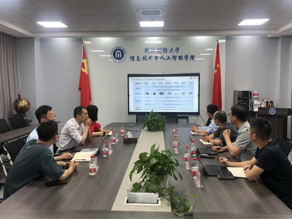 教学院长朱凌首先代表学院对杭州钛比科技有限公司的到来表示欢迎。随后陆震介绍了杭州钛比科技有限公司并做了“高校ICT人才培养解决方案”专题报告。接着,双方围绕物联网创新应用实验室的建设以及ICT人才培养解决方案的个性化等方面展开了深入讨论。