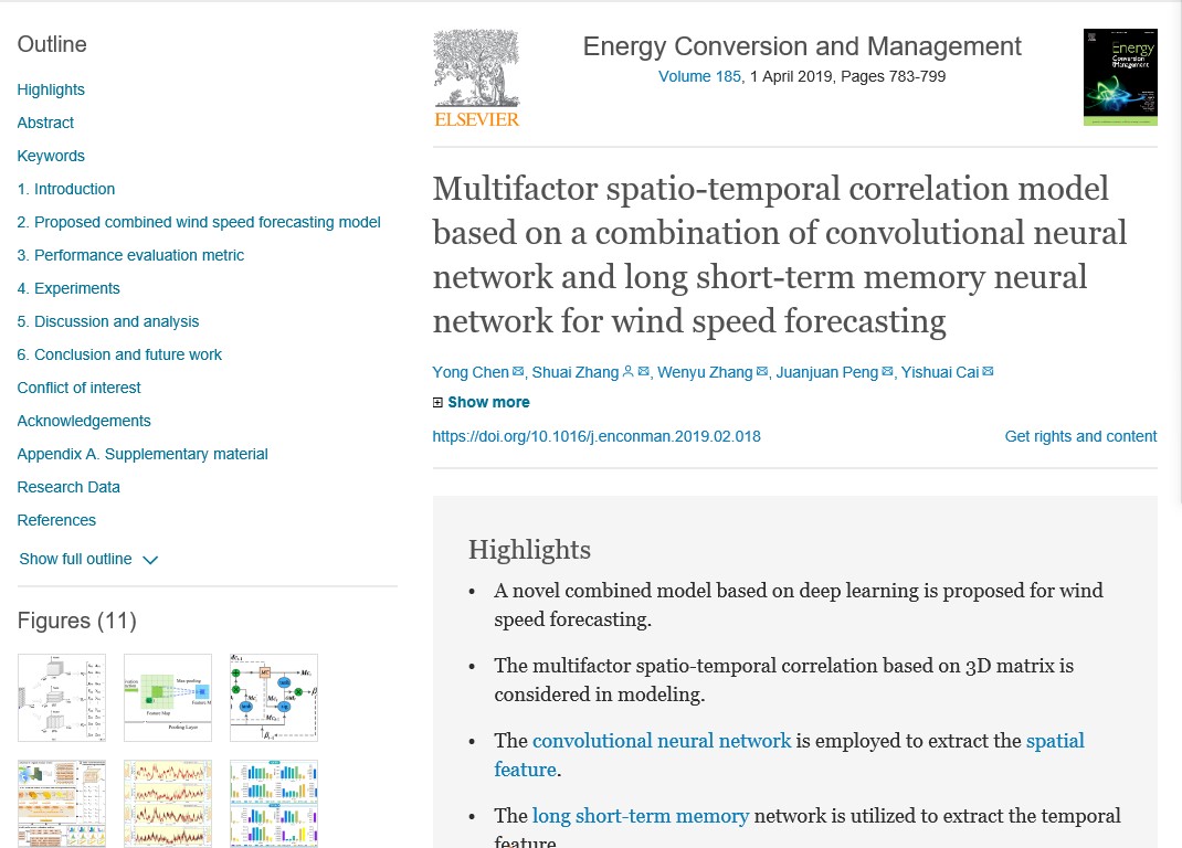 Yong Chen, Shuai Zhang(*), Wenyu Zhang, Juanjuan Peng, Yishuai Cai. Multifactor spatio-temporal correlation model based on a combination of convolutional neural network and long short-term memory neural network for wind speed forecasting. Energy Conversion and Management, 185:783-799, 2019.