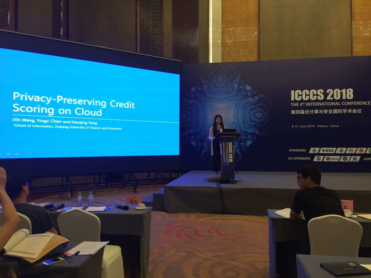 2018年6月8日-10日,由南京信息工程大学等举办的第四届云计算与安全国际会议(ICCCS2018)在中国海南省海口市顺利举行。云计算与安全国际会议(International Conference on Cloud Computing and Security,ICCCS)自2015年发起以来,已成功举办三届,现已成为国际知名的大型学术盛会。大会旨在为国内外从事计算机领域研究和工程技术的专家、学者、学生及技术人员,提供一个交流最新学术成果、探讨学术前沿问题的平台。本次会议聚集了来自中国、美国、俄罗斯、日本、法国、加拿大、意大利等世界各国的700多名专家学者,共同就云计算、信息隐藏、物联网安全、多媒体应用等问题展开探讨。金年会16级企业管理专业研究生陈英姿参加了此次国际会议并在其分论坛就“Privacy-Preserving Credit Scoring on Cloud”主题做会议报告,并与专家学者们进行深入的交流和讨论。