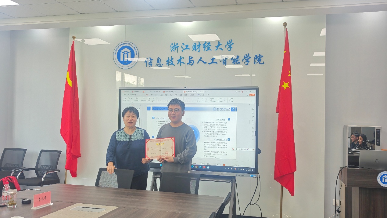 经过点评老师的合议,最终评选出了本期论坛的优秀分享者——夏浩同学,他的报告内容深入浅出,思路清晰,引发与会者的深思,并且在学术讨论中展现了独到的见解,并由刘亚楠副教授为他颁奖。