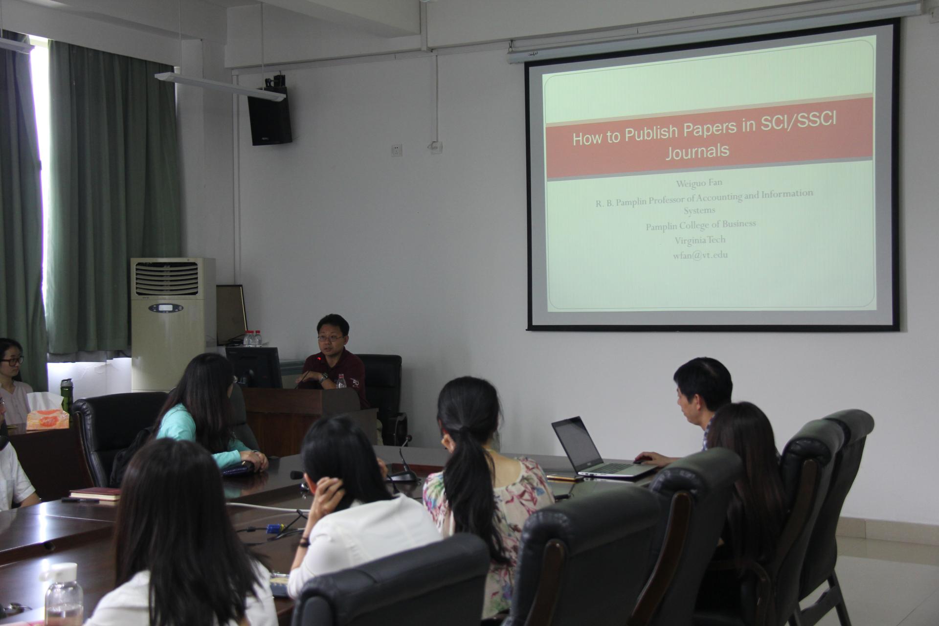 5月19日下午3:00,美国弗吉尼亚理工大学樊卫国教授在学院404会议室为全院师生带来了题为“SCI/SSCI论文写作与发表技巧”的讲座。信工学院近20余名科研骨干、研究生参加了本次讲座。讲座历时一个半小时,樊卫国教授用其生动的演讲,分享了其在顶级期刊发表论文的方法、技巧和经验。