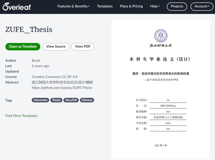 注:老师和同学们可以从本页面下载该模板,按照说明(附件1)使用;也可以打开链接https://www.overleaf.com/latex/templates/zufe-thesis/ztbprkjkqzhm(如下图),注册账号后进入在线LaTeX编辑环境使用。请大家使用时遵守相关版权协议。