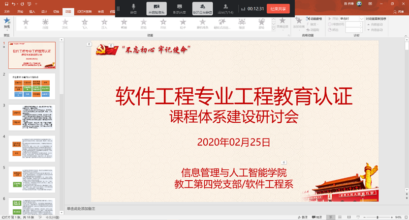 2月25日上午,金年会软件工程专业召开了工程教育认证课程体系建设工作会议。受疫情的影响,本次会议采用线上会议的方式进行。会议由陈伟锋老师主持,软件工程专业课程体系相关任课教师参加本次会议。本次会议的研讨主题是课程体系建设工作中教学大纲的修订,包括课程目标的制定机制、课程目标对毕业要求的支撑关系分析、教学内容的适应调整、以及课程目标达成度计算方法等。经过上一学年对三门基础必修课程的试点建设工作的论证和分析,我们逐步掌握了工程教育工作中课程体系环节相关工作内容和机制,因此,本次会议将启动第二轮全面的课程体系建设工作。