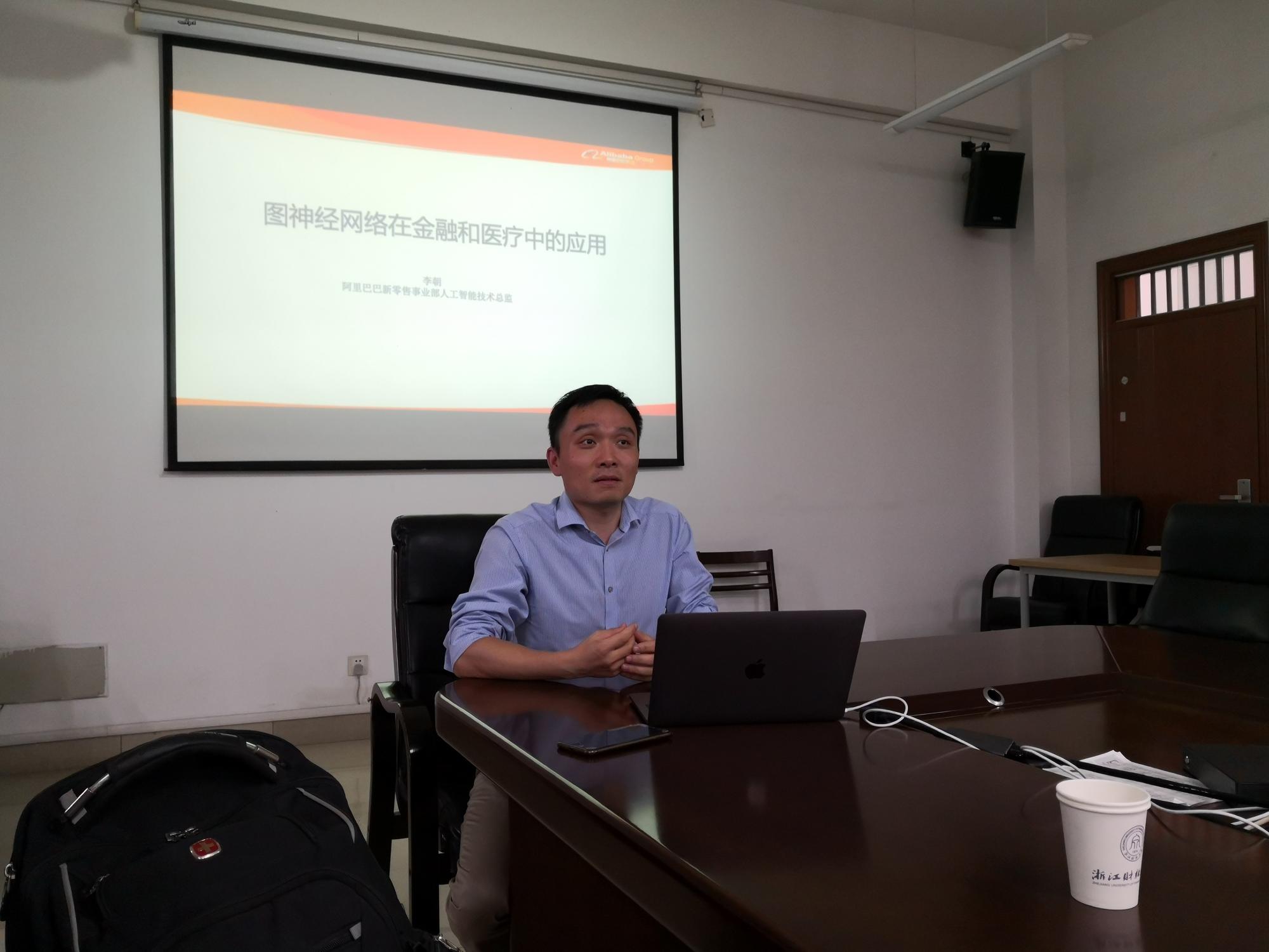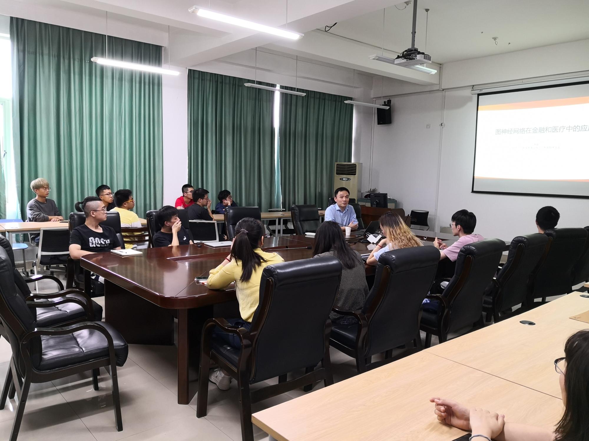 李朝博士首先给大家介绍了机器学习领域中的图神经网络方法,并讲解了图神经网络方法在金融和医疗领域中的应用情况。在后续的讨论环节中,李朝博士详细解答了同学们在人工智能学习中遇到的各种问题,为产学研服务提出了一些思路,对金年会人工智能专业建设提供了许多宝贵的建议。两位老师还与李朝博士就后续的合作研究进行了讨论。