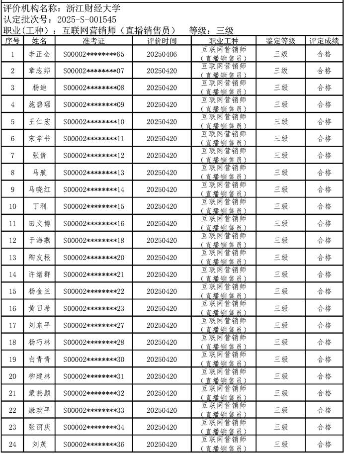 二、关于编号:2025-S-001544互联网营销师(直播销售员)四级职业技能等级认定成绩合格人员结果公示单